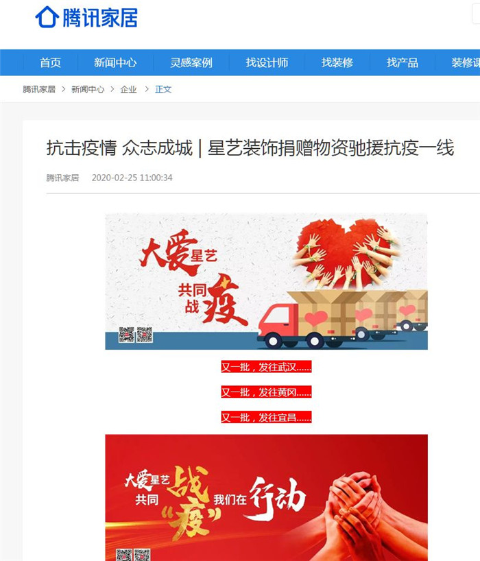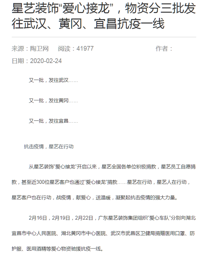 從星藝裝飾“愛心接龍”開啟以來,星藝全國各單位積極捐款,星藝員工自愿捐款,甚至300多位星藝客戶也通過“愛心接龍”捐款……星藝在行動,星藝人在行動,星藝客戶也在行動,戰(zhàn)疫情,獻愛心,送溫暖,凝聚起抗擊疫情的強大力量。