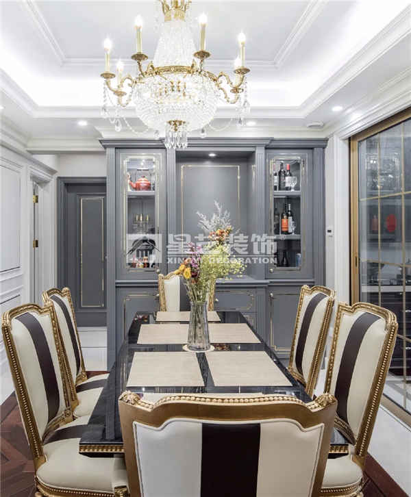 另外,用大量的石膏線條,以及護(hù)墻板的線條和金屬線條的疊加讓整個空間的層次感更強。加上香檳金的推拉門,護(hù)墻板的金屬線條以及后期搭配的家具作為呼應(yīng),讓空間的顏色搭配更加協(xié)調(diào)而不突兀。