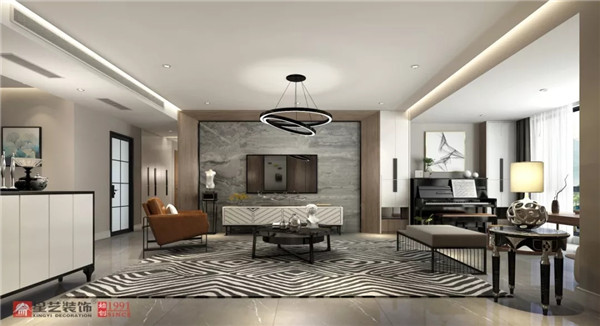 簡(jiǎn)單的擺件讓客廳空間變得更加寬敞,幾何條紋圖案地毯和創(chuàng)意圓形吊燈又不會(huì)讓人覺得單調(diào)。