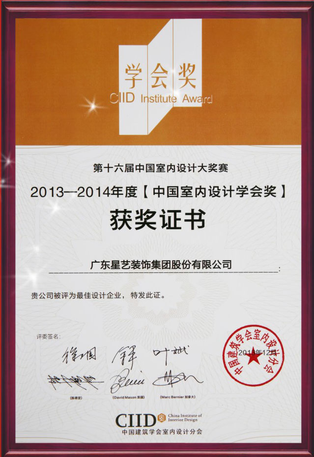 榮獲2013年度中國室內設計學會獎“最佳設計企業(yè)獎”
